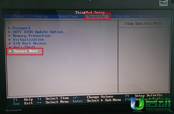 2、使用鍵盤上的左右方向鍵將光標移至“security”欄目,再使用上下方向鍵將光標移至“secure boot”選項,按回車鍵執行,如下圖所示: