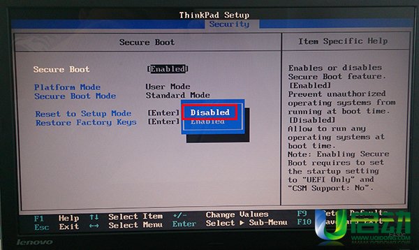 5、完成上面的操作后,secure boot的屬性就修改為“disabled”,然后按esc鍵返回上一步,如下圖所示: