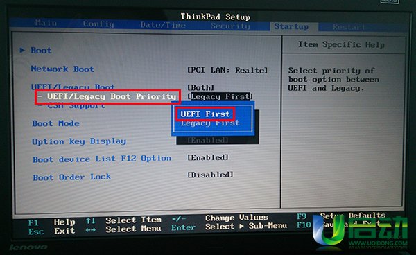 7、然后再使用上下方向鍵將光標移至“uefi/legacy boot priority”選項,按回車鍵確認,此時會彈出一個選擇窗口,將光標移至“uefi first”選項,按回車鍵確認,如下圖所示: