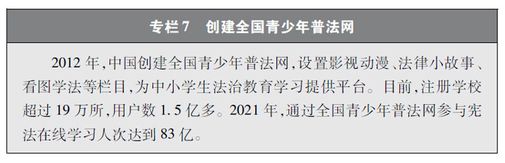 加強青少年網絡法治宣傳教育。青少年是祖國的未來、民族的希望。青少年網民在中國網民中的占比逐步增長。作為互聯網的“原住民”,青少年是網上學習、交流、生活最活躍的參與者、實踐者,其合法權益也更易受到網絡違法活動的侵害。中國從保護青少年網絡權益,促進青少年健康成長、全面發展出發,遵循青少年身心發展規律,貼近青少年學習生活實際,聚焦網絡沉迷、網絡欺凌、網絡淫穢色情信息等重點問題,通過普法微綜藝、兒童普法話劇、網絡普法故事廣播、網絡普法云課堂、學法用法知識競賽、法治副校長進校園、編寫網絡普法讀本等生動活潑、豐富多彩的形式開展法治宣傳教育,逐步形成了政府、社會、學校、家庭相結合的法治宣傳教育格局,為提升青少年網民法治意識和網絡安全素養提供了全面保障。